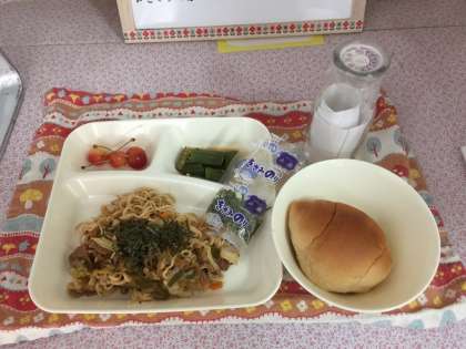 焼きそば、オクラの中華あえ、さくらんぼ、黒糖クレセントロールパン、牛乳