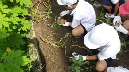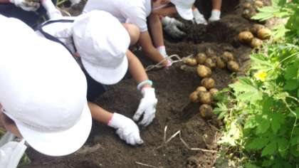 4号校舎の裏で、地域の方が菜園をしています。今日は2年生が、そのうちの「じゃがいも掘り」をしました。土を自分の手で掘る体験ができました。土をさわるのが少し苦手な子もいましたが、たくさん取れましたので、良かったです。少しかわかせてから家に持ち帰りますので、お料理にお使いください。大小さまざまあります。