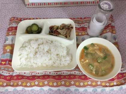 豚肉とピーマンのしょうが焼き、とうがんのみそ汁、きゅうりのピリ辛あえ、ごはん、牛乳