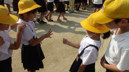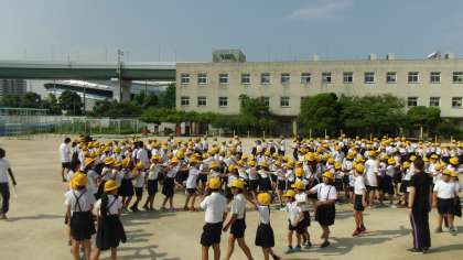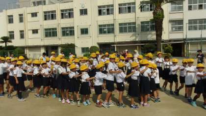 「じゃんけん列車」というゲームで、縦割り班で1年生から順にならんで、音楽に合わせて動いて行って、音楽が止まると近くの班の先頭同士で「じゃんけん」をします。負けたら、勝った班の後ろにつながっていきます。その繰り返しで、最後は大きな列になりました。みんな仲良くできていることに感心しました。