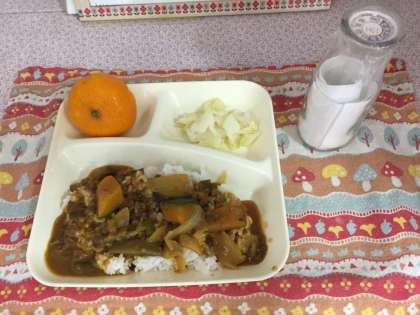 夏野菜のカレーライス、キャベツのサラダ、(冷)みかん、牛乳