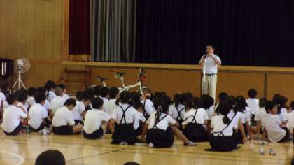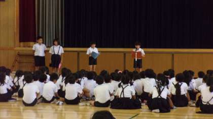 講堂で、1学期の終業式を行いました。夏休みの過ごし方や二人乗りの「タンデム自転車」の紹介、3年生と6年生の代表の児童の1学期の思い出の発表などがありました。暑い中ですが、静かに聞くことができました。安全と健康に気をつけて、楽しい夏休みを過ごしましょう。