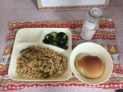 焼きそば、きゅうりとわかめの中華あえ、黒糖ロールパン、牛乳
