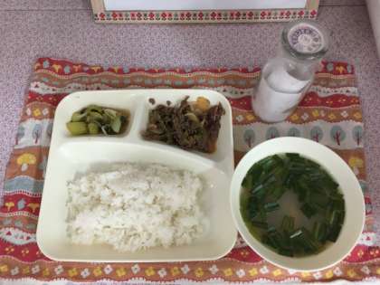 プルコギ、トック、チンゲンサイともやしの甘酢あえ、ごはん、牛乳