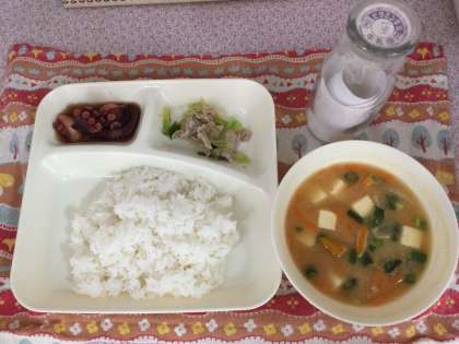 たこのやわらか煮、みそ汁、野菜いため、ごはん、牛乳