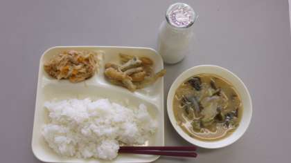 いわしのてんぷら、切りぼしだいこんのいため煮、みそ汁、ごはん、牛乳