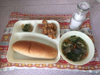 鶏肉のピリからあげ、中華スープ、キャベツと三度豆のあえもの、ライ麦パン、牛乳