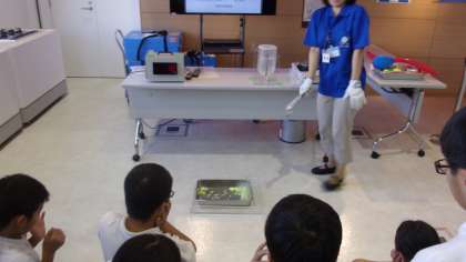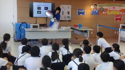 1階の展示場で、LNG(天然ガス)のことについて学習したあと、−196度の液体窒素を使っての実験を見ました。風船の中の空気の体積の変化や、ゴムボールを凍らせる実験で、とっても驚きました。
