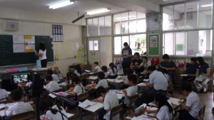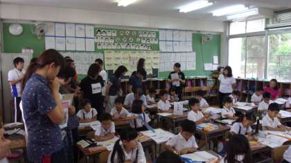 1年生が算数のくり上がりのあるたし算の場面の学習をしています。言語力を高めるためにどんなことをしていけばいいかを、授業を見て討議していきます。田中小学校では、全員の先生が研究授業を行い、授業力を高めていきます。