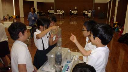また、実際に汚れた水に色をつけて、「砂」でのろ過と「活性炭素」で、においのしない透明な水になる実験もしました。