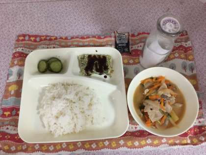 お好み焼き、豚汁、きゅうりの梅風味焼き、ごはん、牛乳