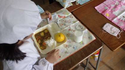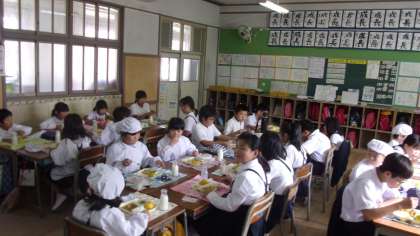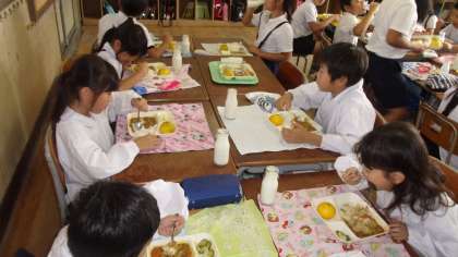 今日は、たてわり班で「交流給食」を行いました。たてわりのチームが集まって、担当の先生の教室で給食を食べました。今日は、カレーと野菜とみかんだったので、早く食べ終わる子が多かったです。