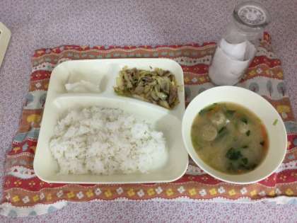 豚肉とまいたけのいためもの、つみれ汁、ういろう、ごはん、牛乳