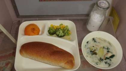ほたて貝のクリームシチュー、ブロッコリーとコーンのサラダ、