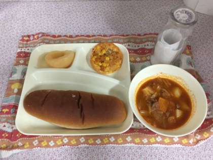 牛肉のケチャップ煮、変わりピザ、白桃(缶)、黒糖パン、牛乳