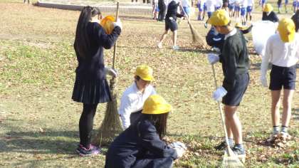 八幡屋公園にたてわり班で、落ち葉ひろいなどのそうじに行きました。地域やPTA、スポーツパークセンターの方々も来られて、お手伝いをしていただきました。とてもたくさんの落ち葉を集めることができました。みなさんもよくがんばりましたね。
