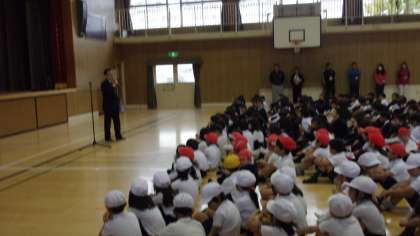 その後、全員が講堂に集まり、警察の方からお話を聞きました。家に帰ってからの「5つの約束」をしっかりと守りましょう。