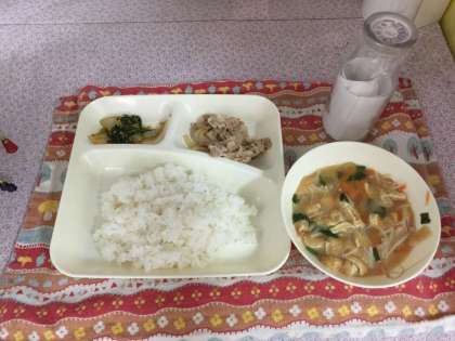 豚肉のしょうが焼き、さつまいものみそ汁、きくなとはくさいのごまあえ、ごはん、牛乳