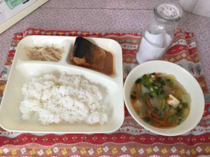 さばのみそ煮、すまし汁、もやしのゆずの香あえ、ごはん、牛乳