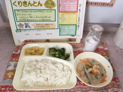 かす汁、ブロッコリーのごまあえ、くりきんとん、ごはん、牛乳