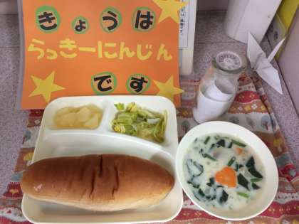 ほうれん草のクリームシチュー、キャベツのサラダ、洋なし(カット缶)、黒糖パン、牛乳