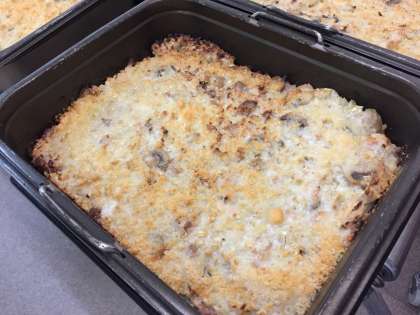 押し麦のグラタン、スープ、いよかん、食パン、牛乳、リンゴジャム