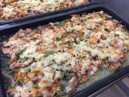 鶏肉とチーズのカラフル焼き、野菜のミネストローネ、ブロッコリーのサラダ、ごはん、牛乳