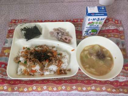 鶏ごぼうごはん、みそ汁、焼きれんこん、牛乳