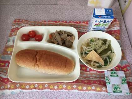 豚肉とごぼうの煮もの、なにわうどん、プチトマト、ライ麦パン、牛乳