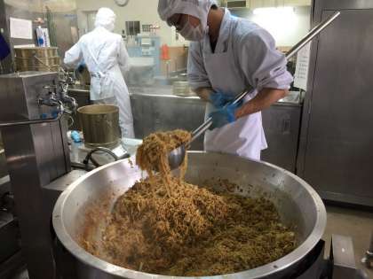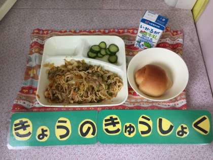 焼きそば、きゅうりのしょうがづけ、黒糖クレセントロールパン、牛乳