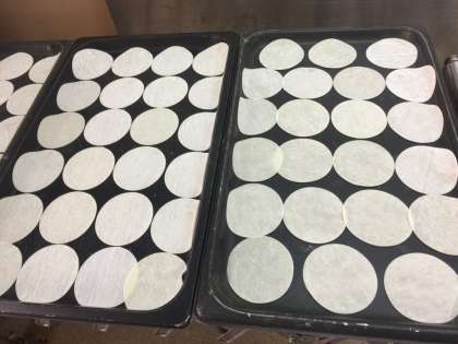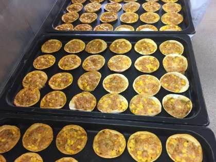 今日の給食の変わりピザは、ギョーザの皮に、ツナ・コーン・ピーマン・ピザソース・チーズを混ぜ合わせた具をのせて焼き物器で焼いています。