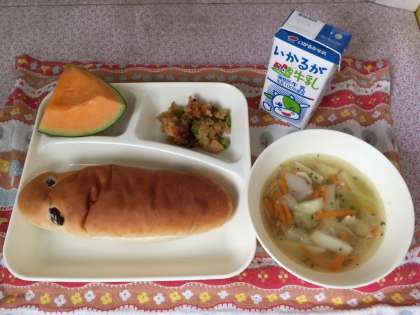カレードリア、スープ、クインシ—メロン、レーズンパン、牛乳