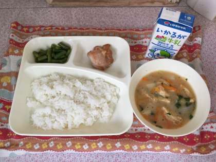 鶏肉のしょうゆバター焼き、みそ汁、三度豆のからしじょうゆあえ、ごはん、牛乳