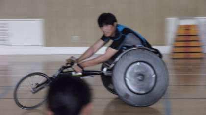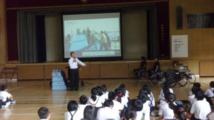 6月30日(土)に行われる「パラアスリートと遊ぼう」のプレ企画で、アスリートの二人に来てもらって、5・6年生にお話と実演をしてもらいました。