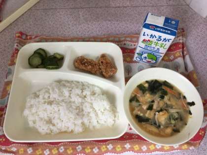 豚肉の香味あげ、みそ汁、きゅうりの甘酢づけ、ごはん、牛乳