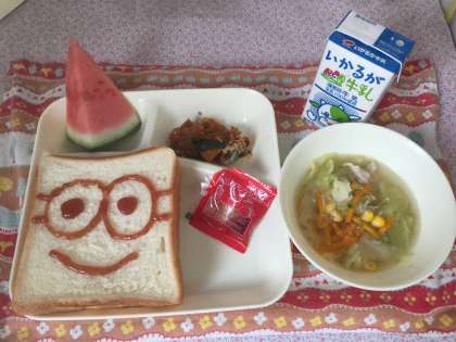 かぼちゃのミートグラタン、スープ、すいか、食パン、牛乳、イチゴジャム