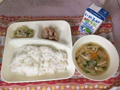 鶏肉のしょうゆマヨネーズ焼き、五目汁、切り干しだいこんのゆずの香あえ、ごはん、牛乳