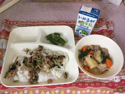 豚肉とじゃがいもの煮もの、オクラの梅風味、ツナっ葉いため、ごはん、牛乳