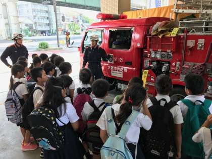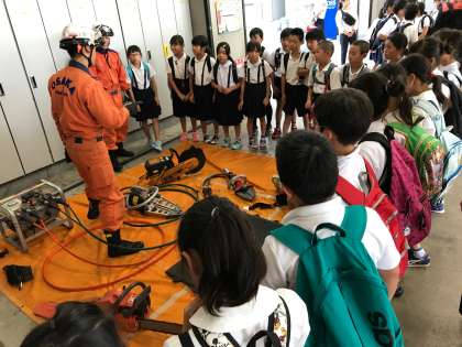 4年生が社会見学で港消防署に行きました。消防署の方から、消防車やレスキューについてのお話を教えてもらいました。