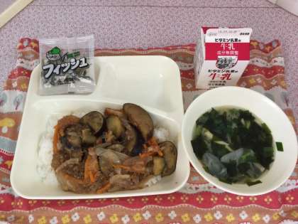マーボーあつあげ丼、中華スープ、ミニフィッシュ、牛乳