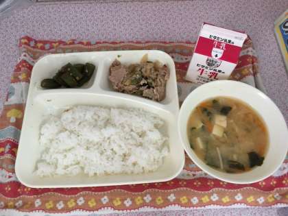 豚肉の甘辛焼き、みそ汁、オクラのおかかいため、ごはん、牛乳