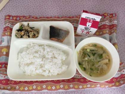 さけのしょうゆ風味焼き、五目汁、高野どうふのいり煮、ごはん、牛乳