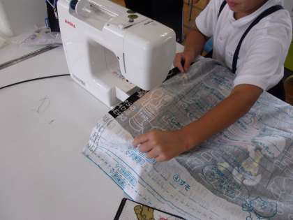 5年生が家庭科でエプロン作りをしています。ミシンを使って縫っていきます。上手にできたでしょうか?