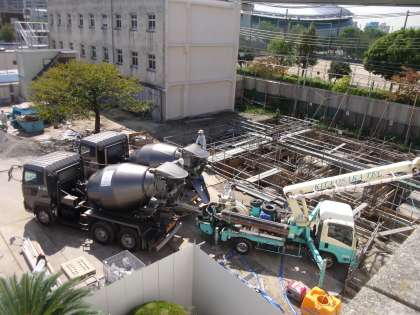 工事の様子です。コンクリートミキサー車も来ていて、基礎工事に入っているようです。