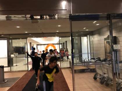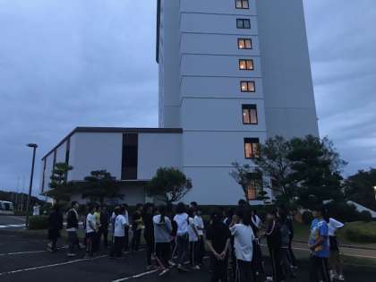 ホテルに着き、着替えて 避難訓練で、駐車場に集まりました。