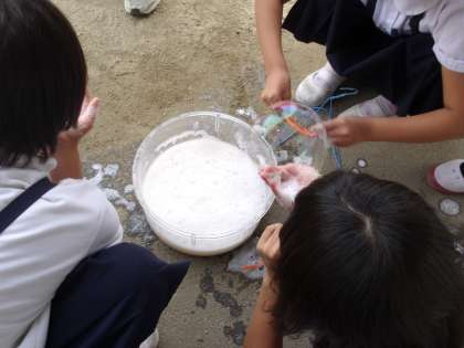 科学クラブは、今日はシャボン玉を作りました。洗剤と水の量で、濃さを調整します。上手にできたかな?