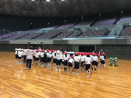 中央体育館のメインアリーナで、低 中 高学年ごとに活動しました。1.2年生は鬼ごっこと人数集めゲームをして楽しみました。