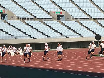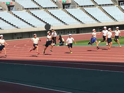 午後からは、陸上競技場で100mの記録を全員計測しました。