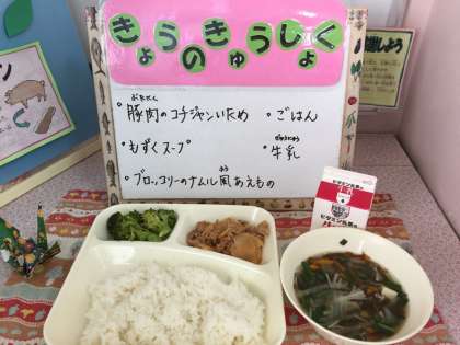豚肉のコチジャンいため、もずくスープ、ブロッコリーのナムル風あえもの、ごはん、牛乳