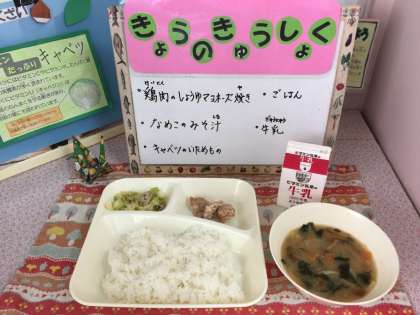 鶏肉のしょうゆマヨネーズ焼き、なめこのみそ汁、キャベツのいためもの、ごはん、牛乳
